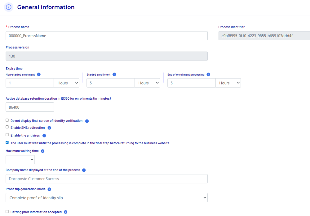 Defines the maximum waiting time for the user before moving to the next step at the end of the process (even if processing isn’t complete). Max duration: 30 minutes.