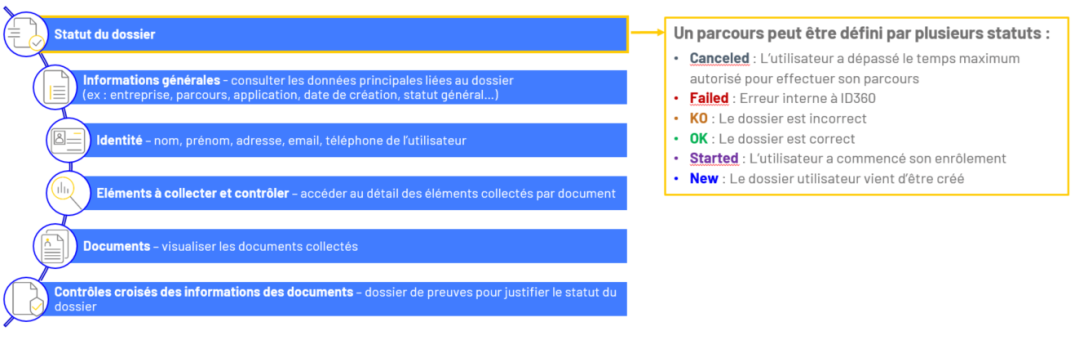 Chaque utilisation d’un parcours est défini par un dossier utilisateur. Vous avez accès à tous les dossiers en cours, quelles que soient les modalités choisies par les utilisateurs. Pour chaque parcours effectué, en cliquant sur « Voir le détail » vous aurez accès à différentes informations telles que :