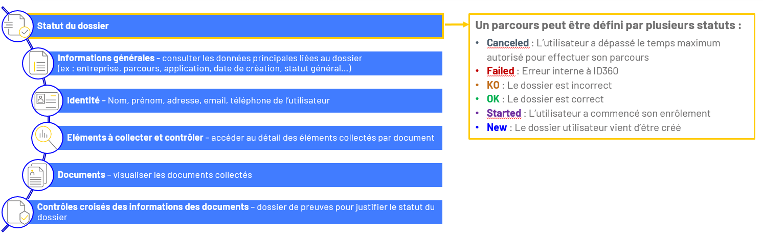 Chaque utilisation d’un parcours est défini par un dossier utilisateur. Vous avez accès à tous les dossiers en cours, quelles que soient les modalités choisies par les utilisateurs. Pour chaque parcours effectué, en cliquant sur « Voir le détail » vous aurez accès à différentes informations telles que :